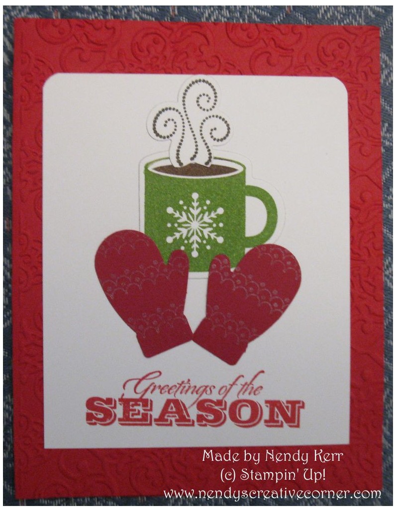 Winter & Christmas Card & Project IdeasThe Make a Mitten stamp set and coordinating Mitten Punch have been challenging me to use them.  I decided to use them with the Scentsational Season Bundle.  I also used the Illuminations ink on the Mittens after I punched them.  This is a quick card to make, although I just might have to take a Hot Chocolate Break!