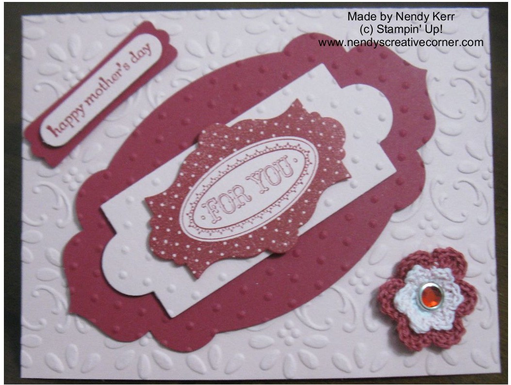 I just wasn’t happy enough with the previous card I had made for Mother’s Day. Here is what I finally mailed to the Mothers in my family. (PS. The crocheted flower is an original Fleurette-long retired. Sorry)