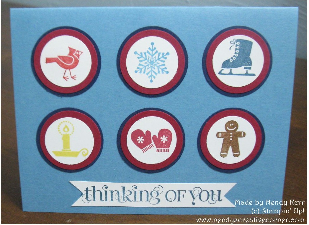 I made a Winter Thinking of You Card for today. I used the Jolly Bingo Bits stamp set, some circle punches, and finished off with a sentiment from Curly Cute. There are so many combinations with the Jolly Bingo Bits set. Change the colors and use can use the Every Little Bit, or Spooky Bingo Bits stamp sets instead. Use any sentiment you need.
