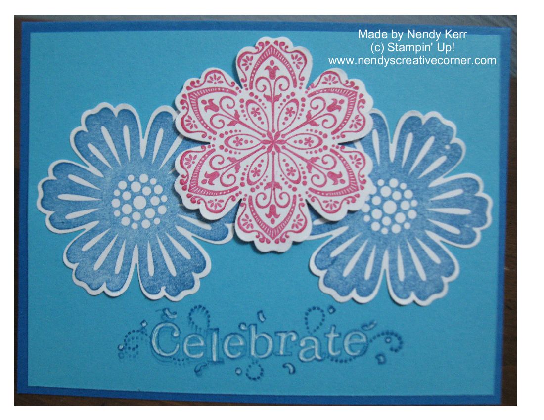 5. Embellishment ideas to step up this card: Put brads, rhinestones, pearls, or small circle punched images in the center of your flowers.