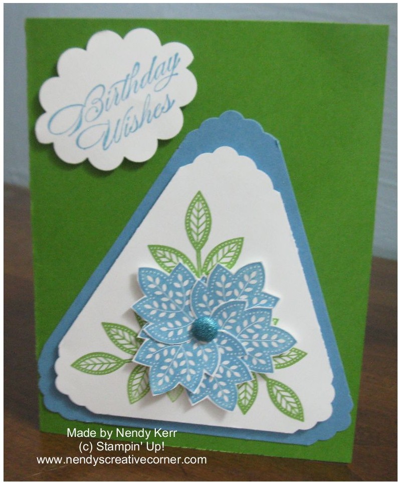 1. Stamp the Day of Gratitude branch of leaves so they form a triangle shape. Use Gumball Green Ink and Whisper White card stock. Cut around the leaves into a triangle shape. Trim the corners slightly and punch by inserting the card stock corner in through the top of the larges flower in the Blossom Petals Builder Punch. Repeat with the other 2 corners in the triangle. Cut a piece of Marina Mist card stock slightly larger than the White Triangle. Trim and punch the corners to match the Whisper White card stock triangle.