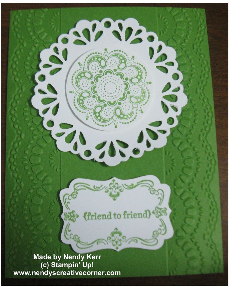 This fun, yet elegant Gumball Green and Whisper White White card has the delicate lacy touches of the Delicate Doilies Sizzlet (#126999), Delicate Designs Embossing Folder (#127023), the Lacy & Lovely stamp set (w#122885 c#122887), the Four Frames stamp set (w#123440 c#123442), Teeny Tiny Wishes stamp set (w#115370 c#127802), the Decorative Label Punch (#120907), and the 1-3/4″ Circle Punch (#119850). TIP: I put a half sheet of printer paper UNDER my Sizzlet to get a good detail cut of all the little pieces. Poke the holes out with your Piercing Tool, Stylus, or a toothpick.
