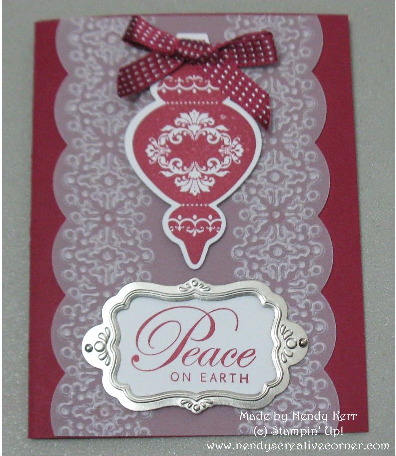 Would you like to make an Elegant Christmas card using your Ornament Keepsakes Bundle? Here is a quick card that uses your Ornament Keepsakes Bundle, the Delicate Designs embossing folder, the Large Scallop Edgelit, and the beautiful metal Flourish Designer Frames. Enjoy making this card as one of your Christmas Cards! It would be pretty easy to mass produce if you send a lot of Christmas Cards. We will be making this card in my Local Stamp Class on December 7th. Register for the Class HERE. I would love to have you join us!