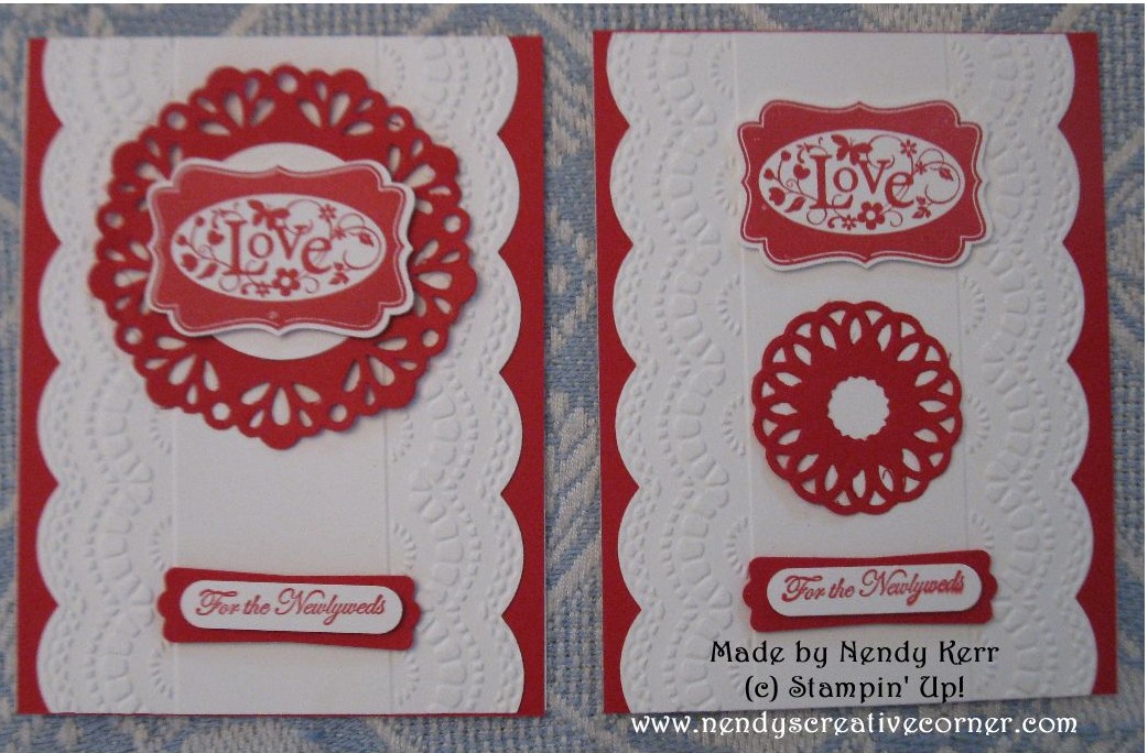 I am behind on Wedding Cards so I made up a bunch of these.  You could use any color, but I was in a Real Red and White mood.  These were fairly quick.  I really enjoy the You Are Loved and Teeny Tiny Wishes Stamp sets.  I cut out a lot of these Delicate Doilies.  Just follow the tips below to get good results.