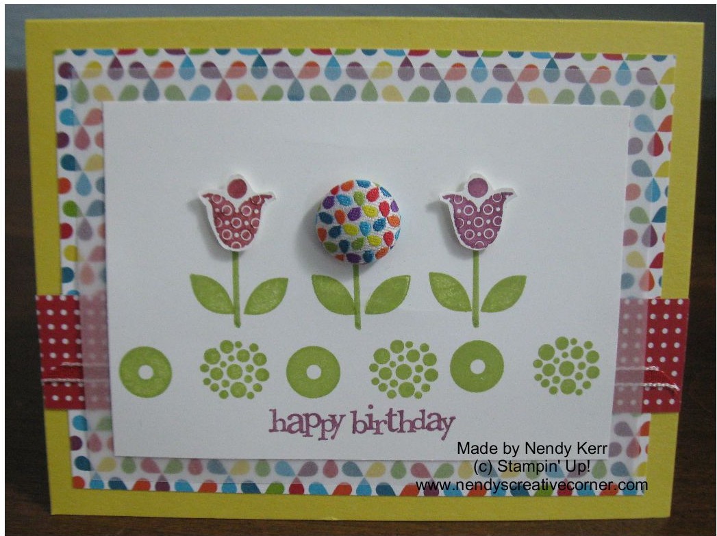 Here is the “Lots of FUN Supplies” Card. SUPPLIES: Stamps: Bright Blossoms Card Stock: Daffodil Delight Whisper White Papers: Paper Vellum Summer Smooches DSP Other: 1/8″ Real Red Taffeta Ribbon Summer Smooches Fabric Brads