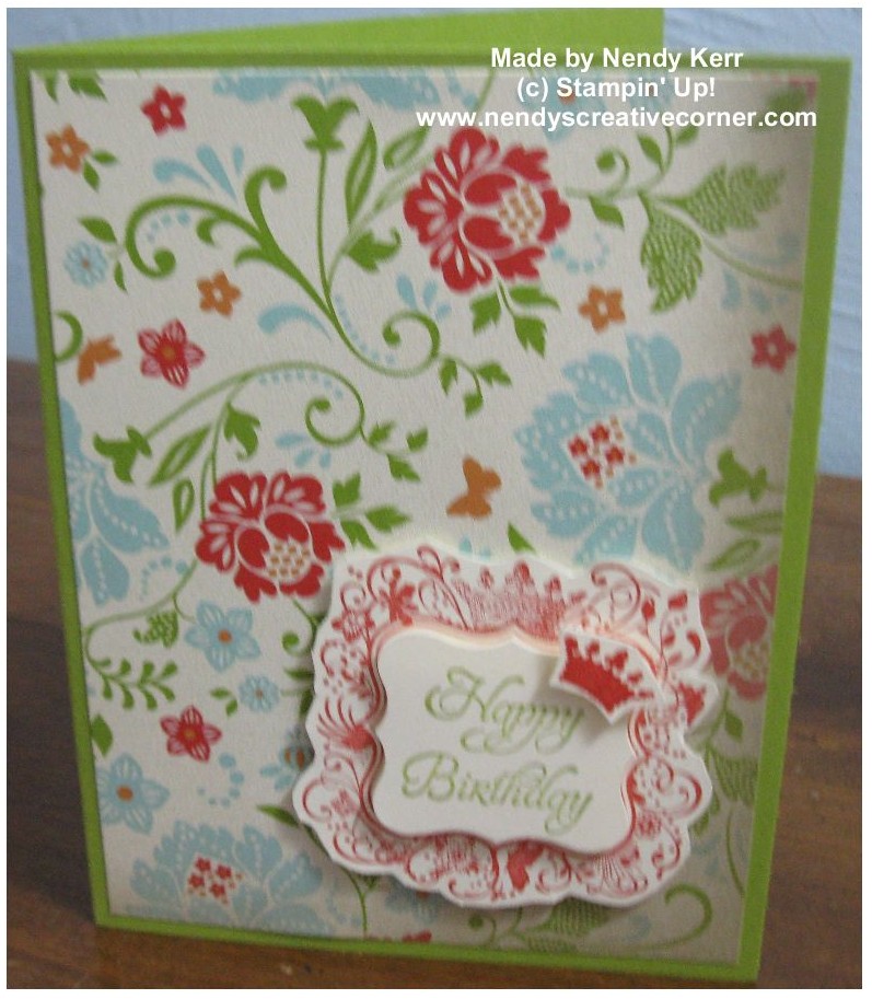I am home again and able to get pictures off my camera card again! Here is a card I made with Sale-a-bration (SAB)products.  Hopefully I remember all the supplies correctly.Smile