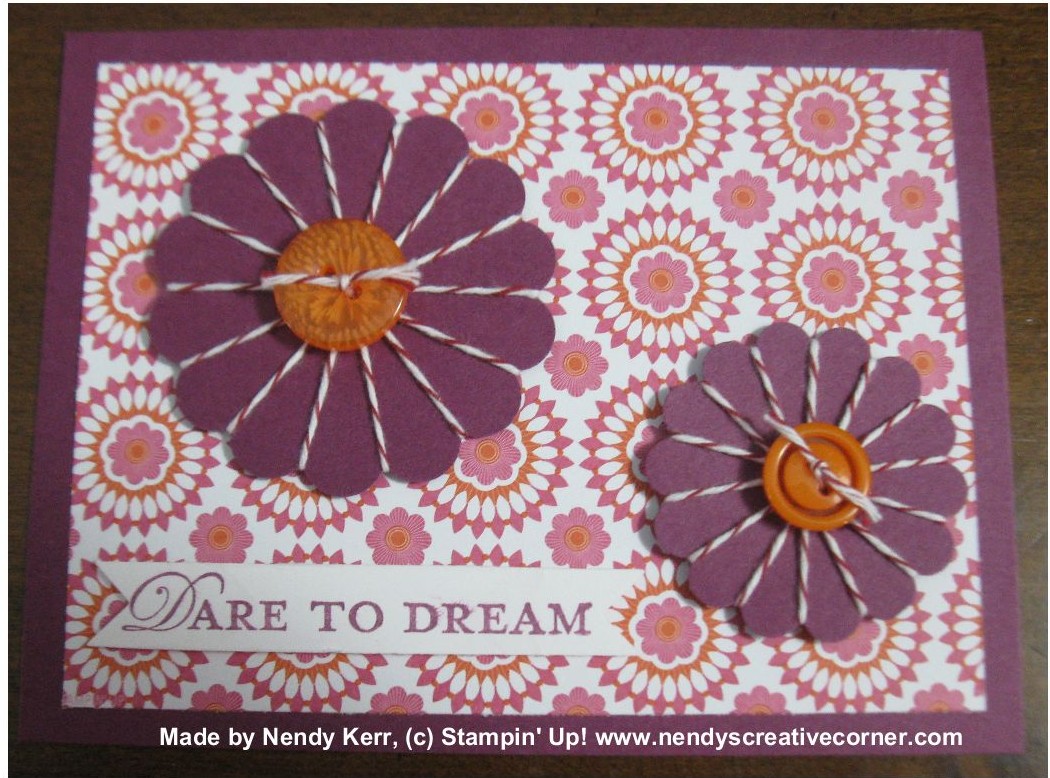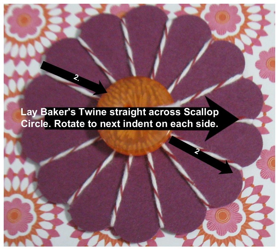 2. Punch a 2-3/8″ Scallop Circle and a 1-3/4″ Scallop Circle. Tape the end of your Baker’s Twine to the back of one Scallop Circle. Put Baker’s Twine in the indent between two scallops and lay it straight across the Scallop Circle so the Baker’s Twine divides the circle in half. Lay the Bakers Twine in that indent that is directly across from the first indent. Move clockwise to the next indents laying the Baker’s Twine across the back and the front of the Scallop Circle until you have filled all the indents. Cut the Baker’s Twine and tape to the back of you Scallop Circle. Repeat with the second Scallop Circle. Choose 2 buttons. Thread Baker’s Twine through the holes and tie a knot. Trim ends. Adhere to the center of your Spirilli with Glue Dots. Adhere Spirilli to card front with Dimensionals.