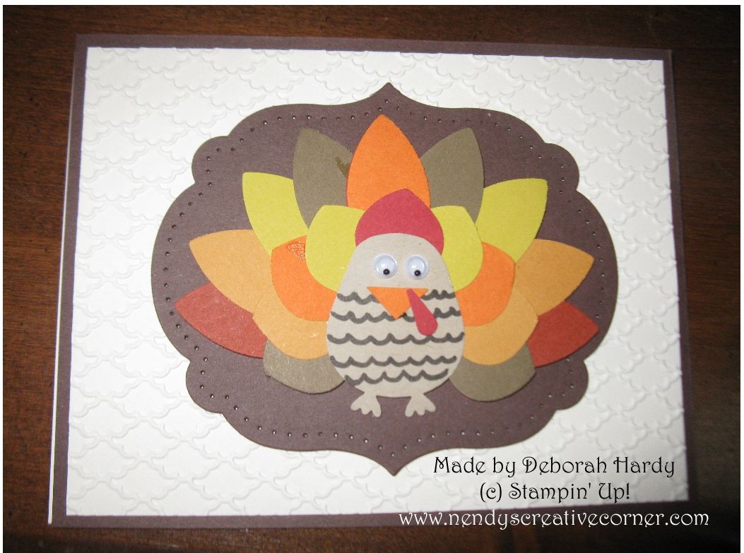 Happy Thanksgiving!We made this Punch Art Turkey at Stamp Class this month.  Here is Deborah’s stepped up version.  She changed the colors a bit and used the thick end of the marker.  She also used the Festive Paper Piercing Pack (#127857) to pierce around the Labels die cut.  This was also one of My Newsletter Projects for November.  If you want the supply list and instructions with pictures, then please signup for My Newsletter and register for My Newsletter Project Pages.  This is a FREE Service I offer my Newsletter Subscribers.
