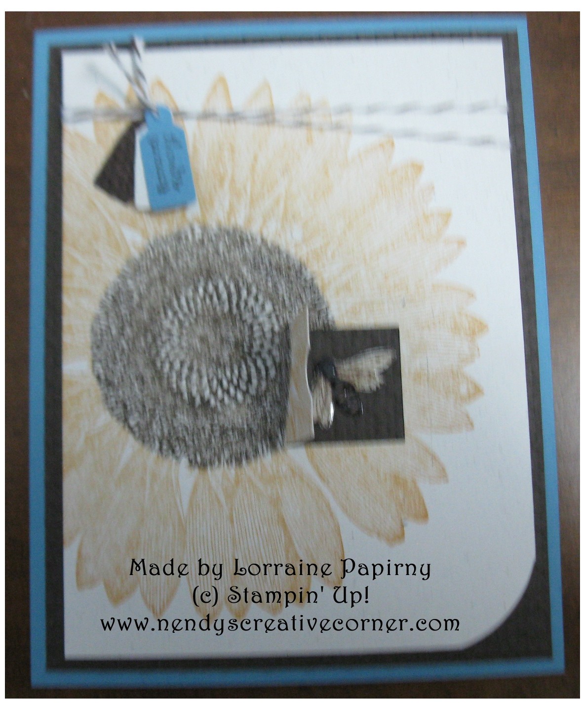 I received this Sunflower card as a Convention Swap from Lorraine Papirny. She used the Sunflower stamp and the bee from Nature Walk. I don’t have either of those, so as usual, I substituted. I think it turned out nicely. Some of my customers made a “Favorite Swaps” list of cards they wanted to make. The Sunflower card was on the list so we will be making my Hello Doily version in class on Friday.