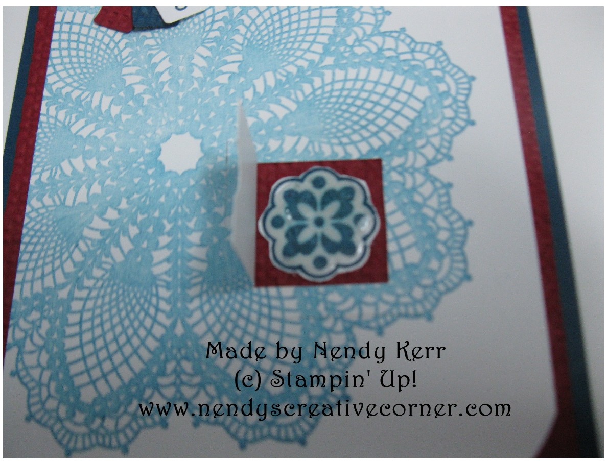 5. Round the lower right corner if desired using the 1-3/4″ Circle Punch. Use the Tombow Glue to glue your large Hello Doily layer to the Cherry Cobbler layer. Glue around the edges of your Peekaboo and position in the punched out area. It looks like you are magic!