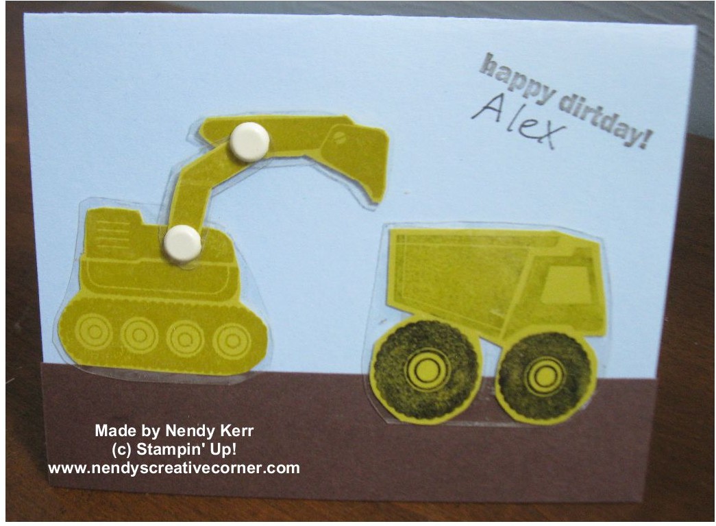 1.  Stamp ‘Digger’ truck twice on Summer Starfruit card stock with Summer Starfruit ink.  Cut the bottom and top parts out of one stamped image and the center ‘arm’ out of the second stamped image.  Cover both sides of all three parts with packing tape and cut them out again.  Use Paper Piercing Tool to poke holes where the parts connect on all three pieces.  Insert brads, but not too tightly.  You want the parts to move easily.  Put Sticky Strip around the bottom part of the ‘digger’ truck.  Set aside.
