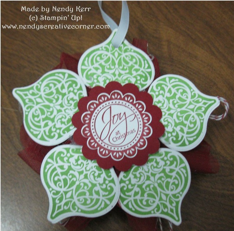 10. Punch 2-3/8″ Scallop Circle. Glue to back of Ornament. Stamp Joy and punch out with 1-3/4″ Scallop circle. Glue to larger scallop circle.