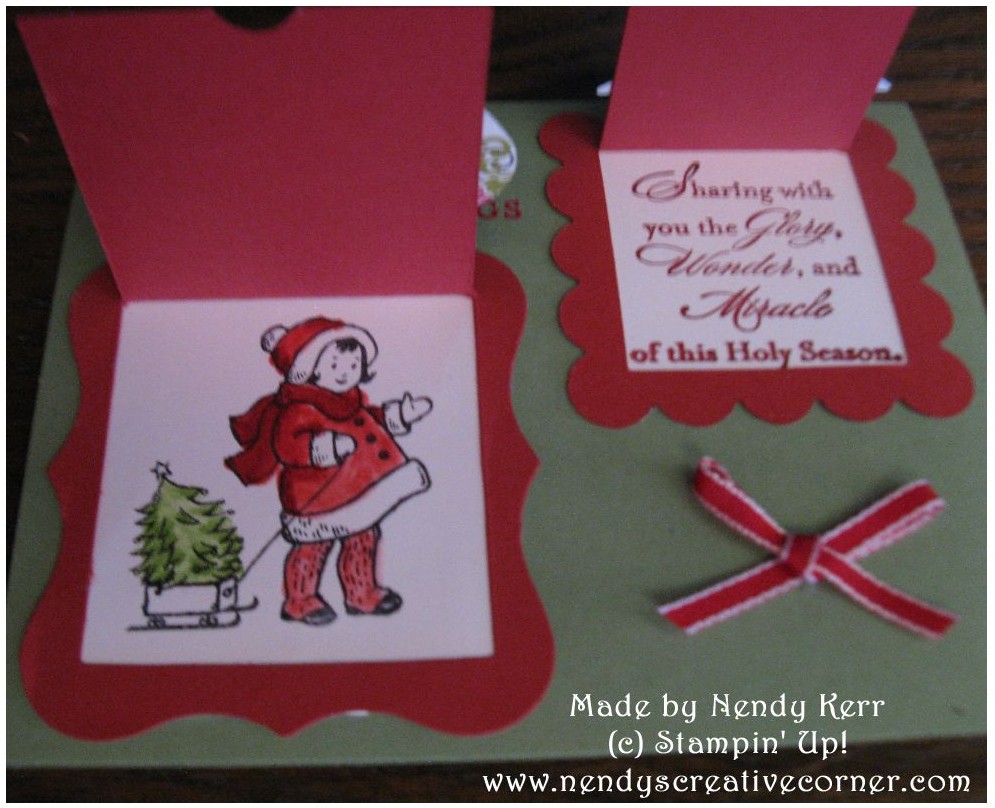6. Decorate the Front of the Curly Peekaboo Frame with a punched 1-3/4″ Whisper White Scallop Circle. Punch one mitten with the desired DSP pattern. Flip the DSP over and punch another mitten. Adhere to the Curly Peekaboo Frame Flap making sure to stay below the score/fold line. Yes, one of my mittens does hangout over the edge of the flap. Just make sure you don’t have adhesive on the part that hangs over.