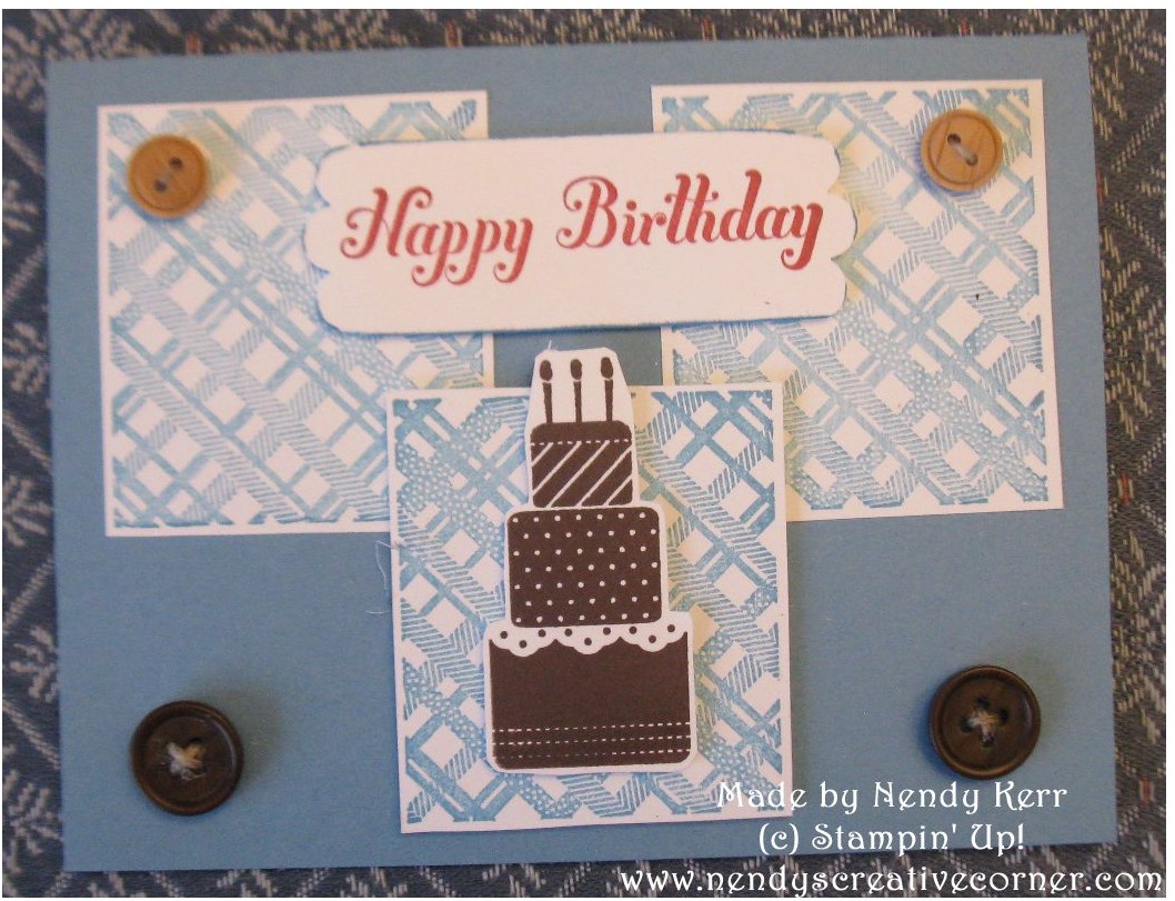 3. Choose the Plaid Design you want. Stamp it three times in the desired ink color on Whisper White card stock. Stamp the Cake in Chocolate Chip ink on Whisper White card stock. Cut the Cake out with your Paper Snips. Cut the Plaid images out with Scissors or your Paper Trimmer.