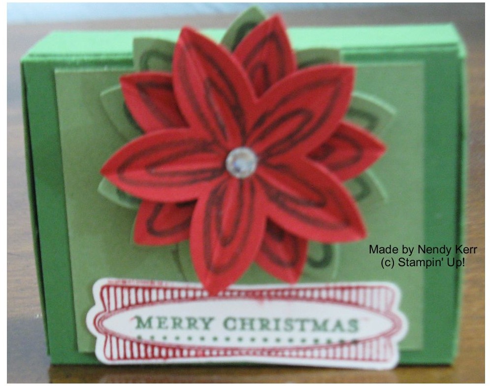6. Stamp the 5 Point flower from Flower Fest twice in each color: Bravo Burgundy ink on Real Red card stock and Garden Green ink on Wild Wasabi card stock. Punch out the flowers with the 5 Petal Flower punch. Score down the center of each Real Red petal. Put a Dimensional under the center of the top Real Red flower and adhere it to the top of the second Real Red flower alternating petal positions. Place another Dimensional under this second flower and adhere to a Wild Wasabi flower (leaves). Cut the last Wild Wasabi flower apart into separate petals. Position so they stick out a little further than the other leaves and alternate positions. Add a large rhinestone to the center of the flower.