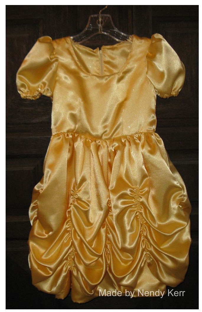 I made this dress for my granddaughter. She wanted a Belle dress when I visited her earlier this year. Well, after a lot of sewing, and even more thought, it is finished!! All the thought came because I wanted her to be able to play in it without breaking the gathering threads in the upper skirt. I finally used elastic and a very wide zig-zag stitch to make the gathers in the skirt. It looks better with the elastic gathers than with the gathering threads. The fabric has glitter in it, so my table, chair, and the ironing board are all covered with sparkles! It only cost about $20 to make. It is machine washable and dryable. And now she can play in it without me worrying about the gathers breaking.