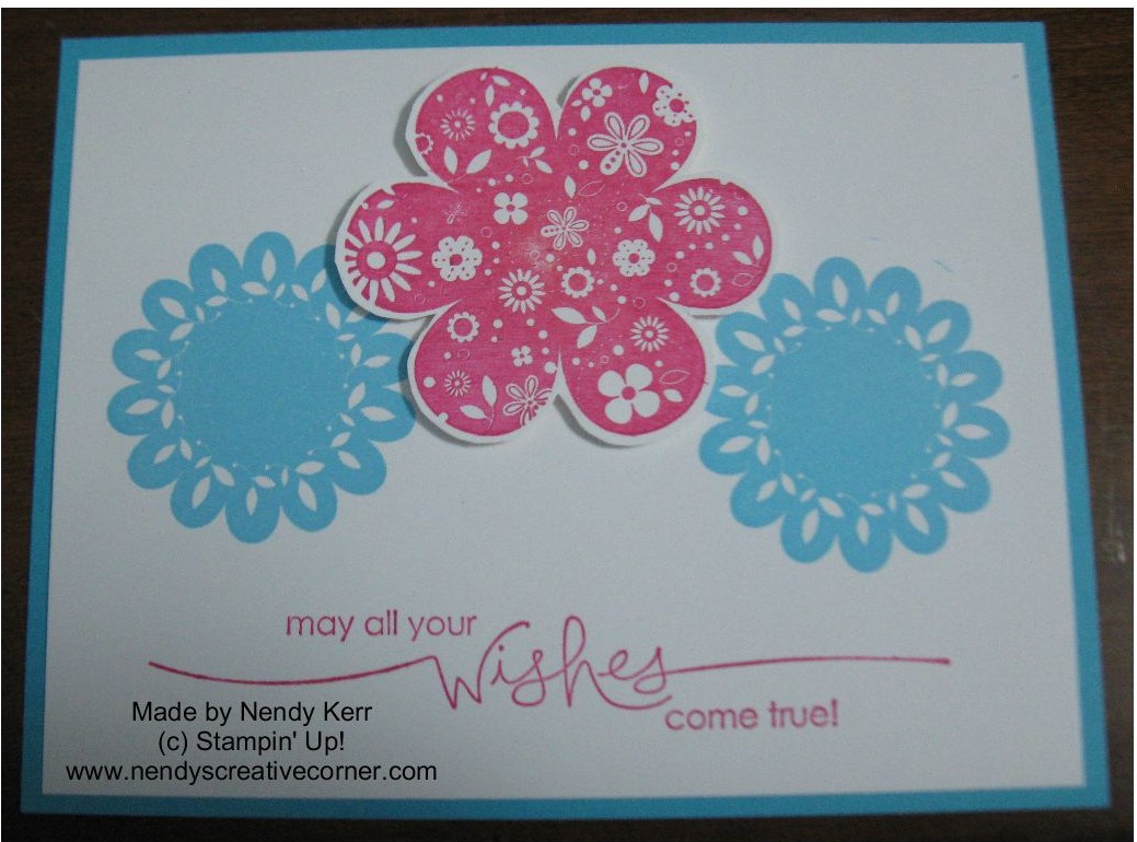 Make this quick card using the Printed Petals stamp set (w#116679 c#120444) and a sentiment set. I used the retired Heard from the Heart stamp set. I used Whisper White and Tempting Turquoise card stock. I used Melon Mambo and Tempting Turquoise ink. I hand cut the Melon Mambo flower and used Dimensionals to pop it up.