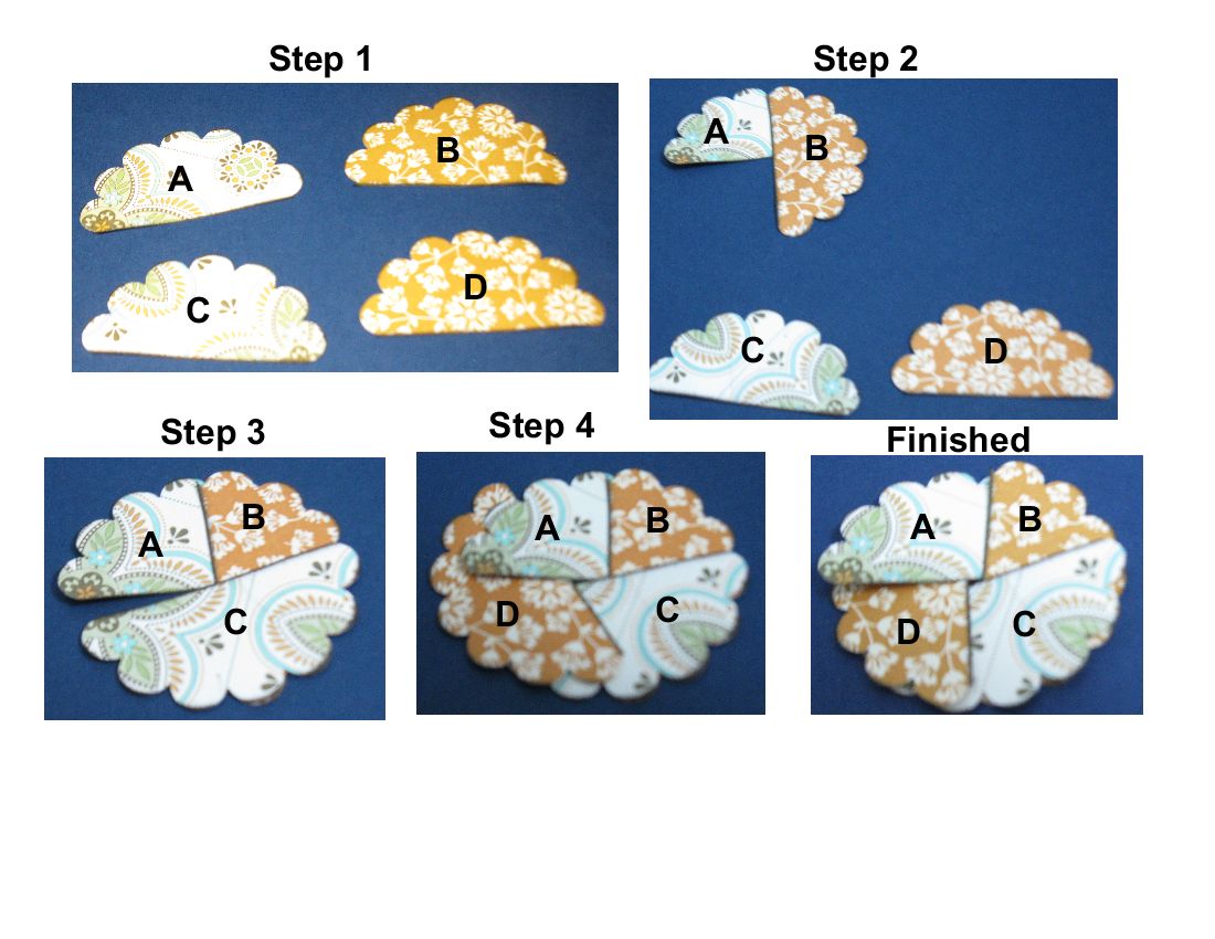 4. Punch 2 1-3/4″ Scallop Circles from two patterns of Spice Cake DSP. Cut each circle in half and rub edges on Early Espresso ink pad or sponge edges. a. Hold pattern 1. Place pattern 2 over the pattern 1 piece, aligning the scallops. Use adhesive of choice. b. Place 2nd pattern 1 piece over the single layer of the pattern 1 piece, align scallops. Adhere. c. Place last piece under one side and on top of the other side so the patterns alternate. Adhere.