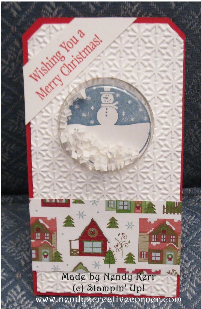 5.  Put some SNAIL or Glue Dots on the Snowman paper and around the base of the Treat Cup.  Position under your Punched Circle on the Whisper White Tag front.  Now adhere the whole thing to the Real Red Tag back.  Trim the upper two corners so they match.