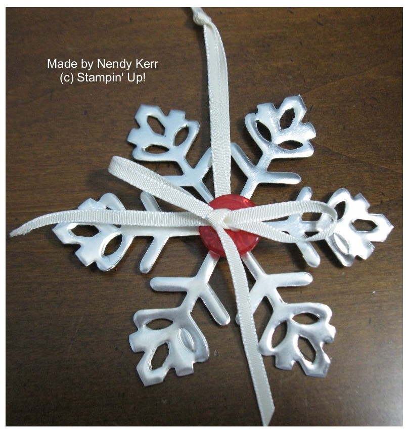 3. Decorate as desired. I threaded a button with 1/8″ Taffeta Ribbon going around the snowflake before threading the button’s second hole. I used the same ribbon as a cord to hang from the tree.