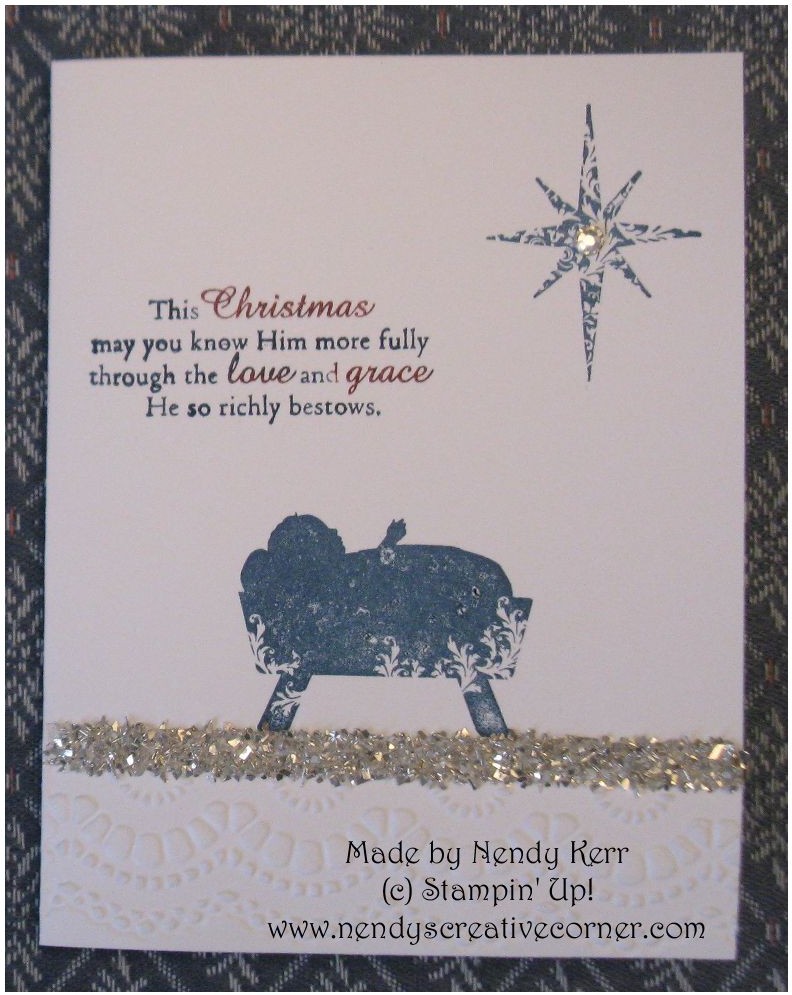 Today I have a Sparkly Christmas Card for you.  I received a similar one as a swap at Convention.  I used the First Christmas stamp set from the Holiday Catalog.  I used Silver Glass Glitter and a Rhinestone for the Sparkly bling.  This is a quick card to make.  It would be easy to make multiples of this card.  Just do all the Glass Glitter last.
