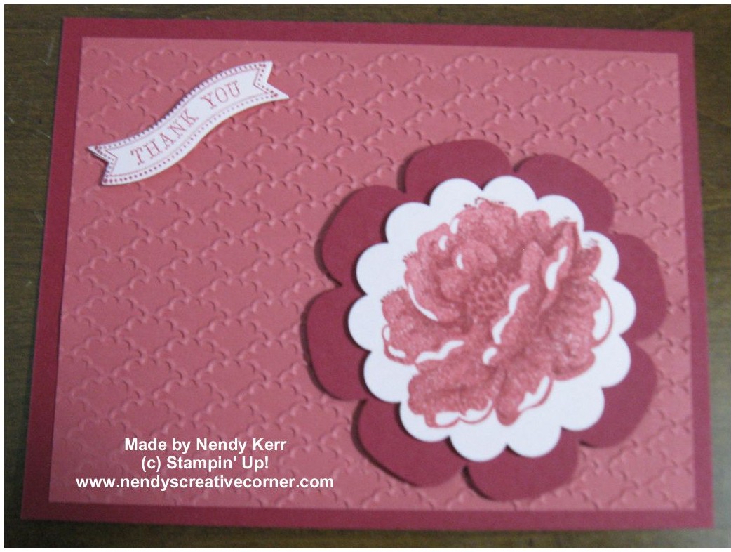 2. Primrose Petals card front layer: 3-3/4″ x 5″. Emboss with Fancy Fan Folder and your Big Shot. Adhere to Raspberry Ripple card front.
