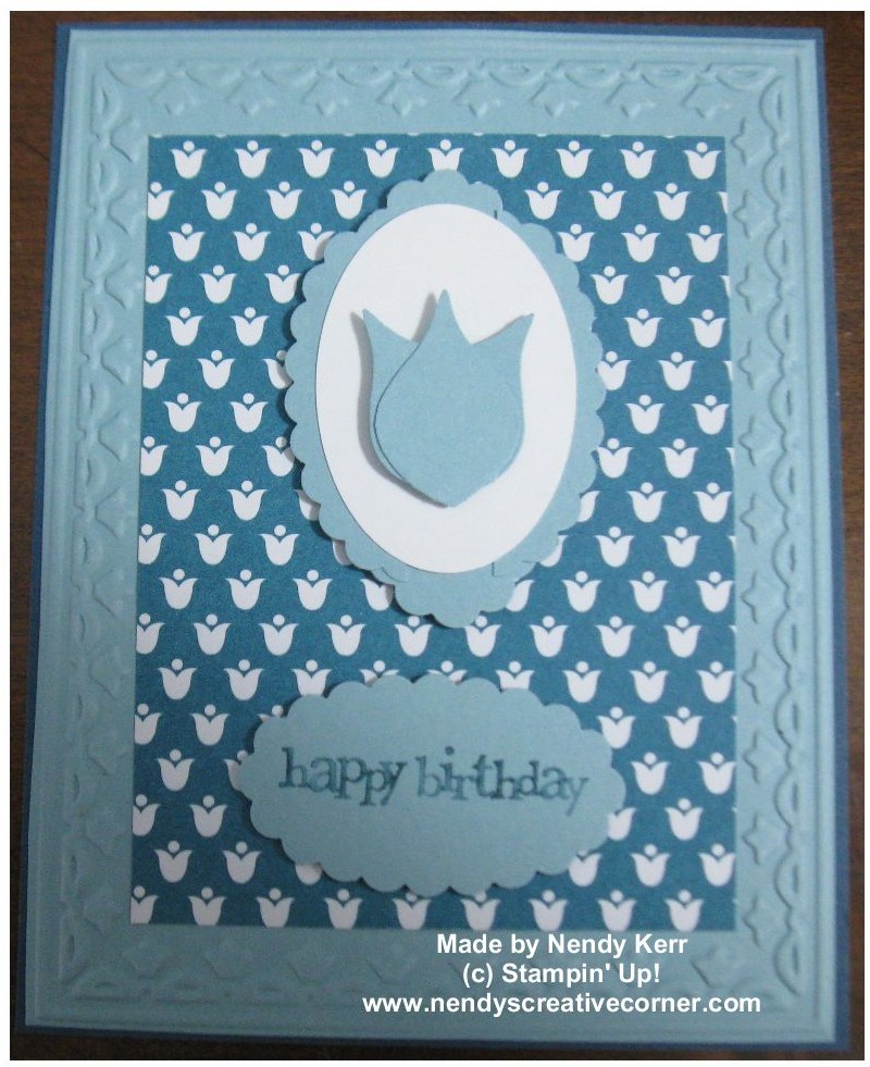 Since I have had the Summer Smooches DSP on my table, I decided to make a card with the tulip print. I remember making tulips before with the Bird Builder punch (using the wing) so I thought I would try it again. I made the Scallop Oval punch large enough to go around the oval by using the process as I did HERE on November 12, 2010. (This is my old blog. You will have to go back to the third page.) I used Baja Breeze and Island Indigo card stock, the Extra Large Oval punch, and the Framed Tulips embossing folder. Enjoy making this card!