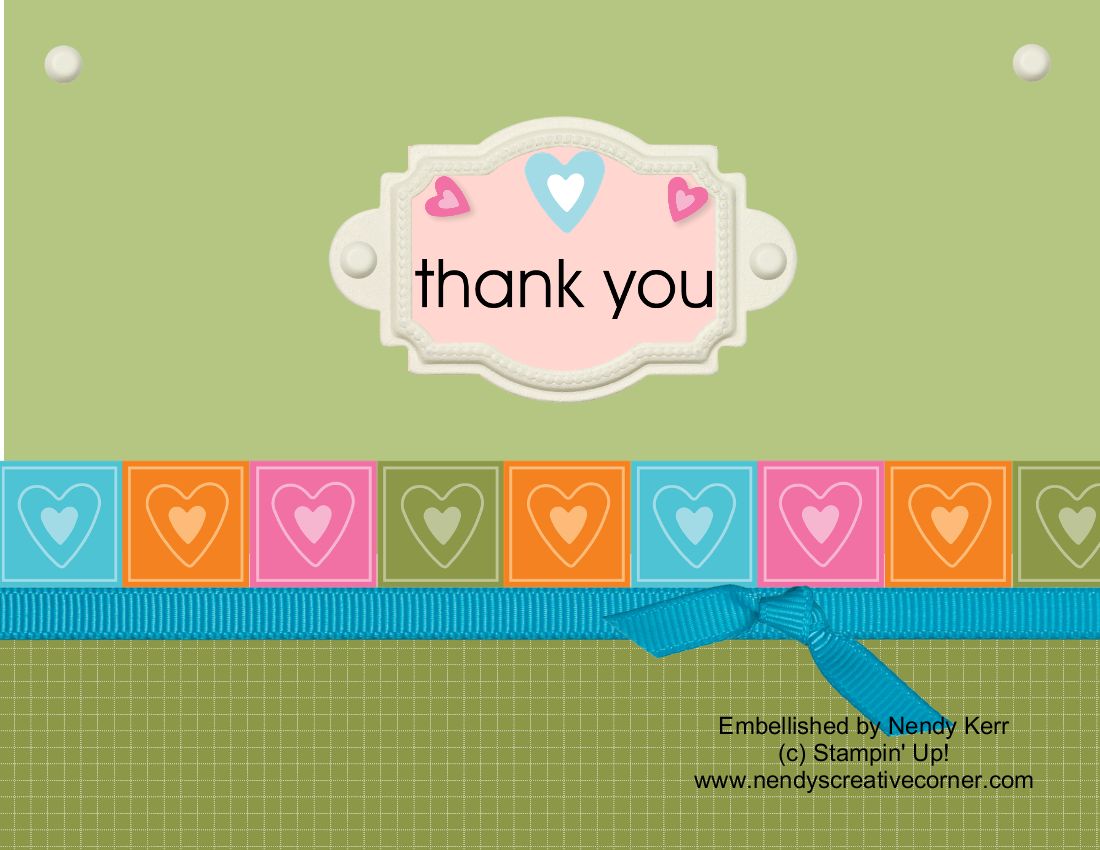 I added a Certainly Celery page layer to the top of this card.  I turned the “Thank You” into the focal point by adding a piece of Vanilla Hodgepodge Hardware around the Thank You with some of the Sunny Day Heart embellishments over a piece of Pink Pirouette card stock.  I then finished up by adding the same Vanilla Hodgepodge Hardware brads to the corners.  I used the copy and paste (Ctrl C for copy on a PC and Ctrl V for paste.  On a Mac use the little apple shape instead of Ctrl.  I LOVE copy & paste!!)