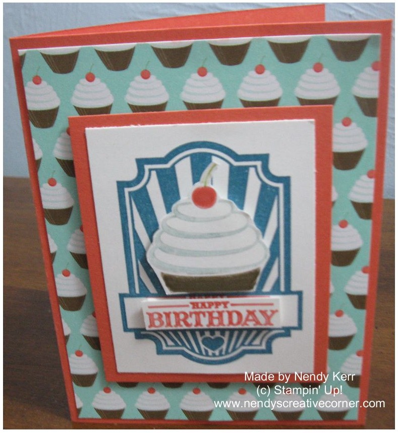 Cut card stock:  Calypso Coral card base:  5-1/2″ x 8-1/2″ score and fold at 4-1/4″.  Sweet Shop cupcake DSP:  5-1/4″ x 4″.  Calypso Coral layer:  3″ x 3-3/4″.  Whisper White layer:  2-5/8″ x 3-1/2″.  Adhere Sweet Shop DSP to Calypso Coral card base.