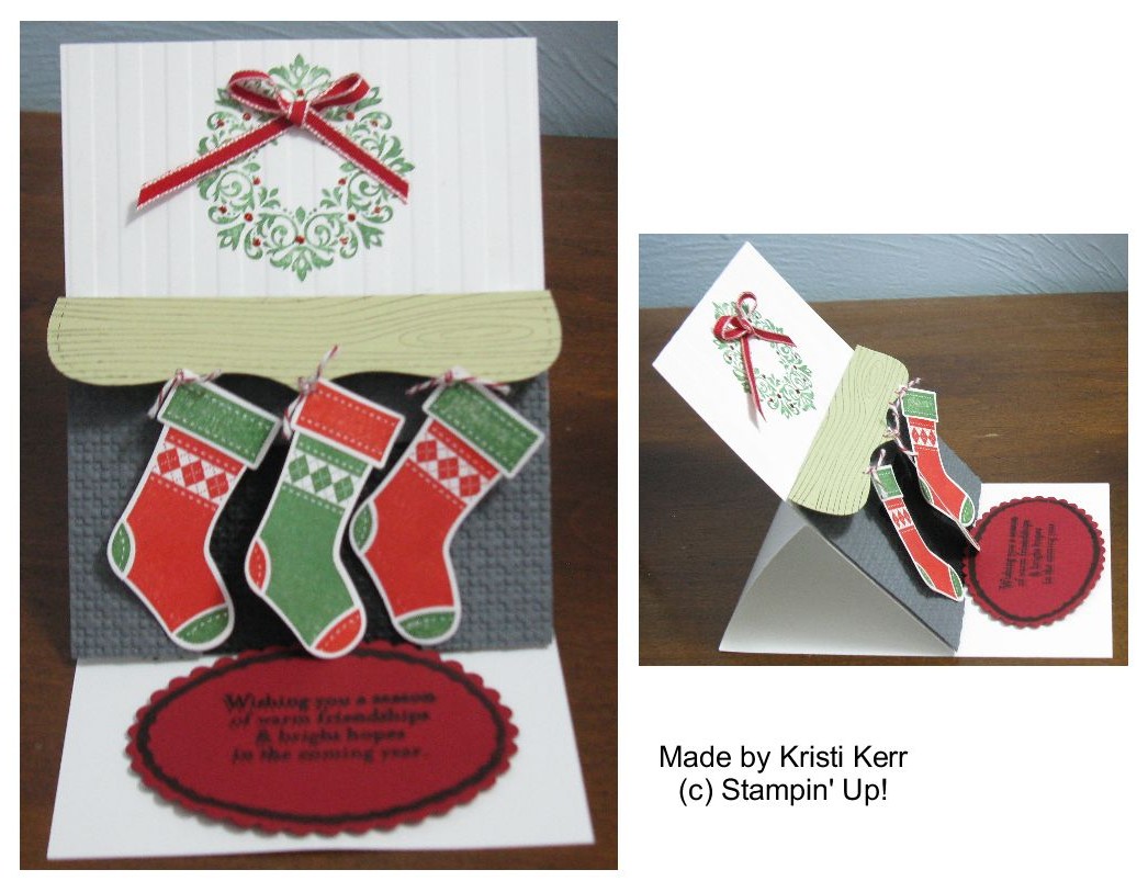 4. Stamp stockings on Whisper White cardstock and decorate as desired. Punch with Stocking punch. If using Baker’s twine, punch hole with Paper Piercing tool and thread twine through hole and tie a bow (You can also pierce a hole in the mantle to attach the stockings with Baker’s twine). If using Mini Jingle Bells, adhere with glue dots.