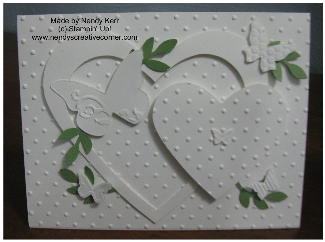 I CASED myself when making this White-on-White card for a friend’s wedding. Check out THIS POST for basic instructions. I used the Beautiful Wings Embosslit (#118138) instead of the Boho Blossoms punch. The card front is 4-1/4″ x 5-1/2″ and is adhered directly to a Whisper White card base.