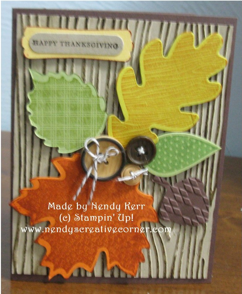 Here is a fun Autumn or Thanksgiving Card. I love the colored leaves of Fall. I used the Autumn Accents Bigz die, the Wonderfall stamp set, and the Woodgrain embossing folder from the Holiday 2012 Catalog.